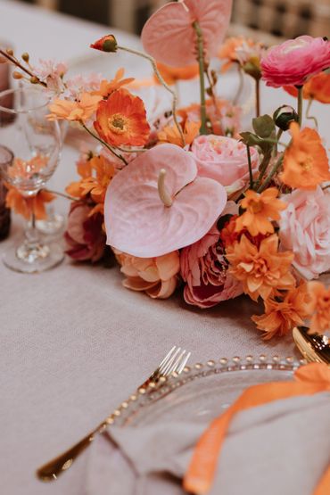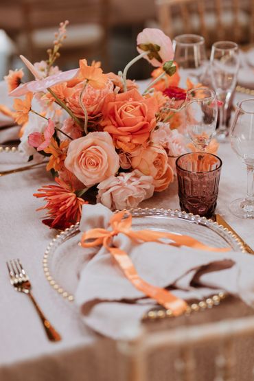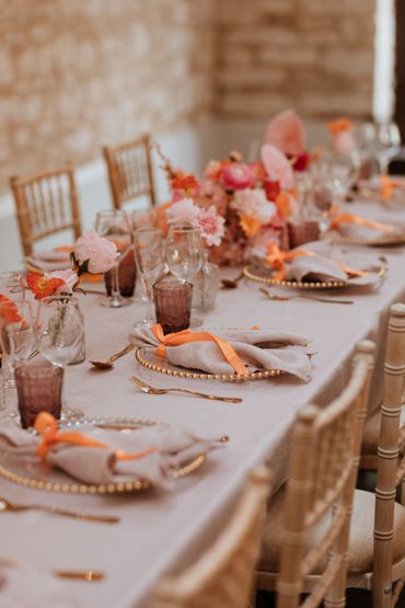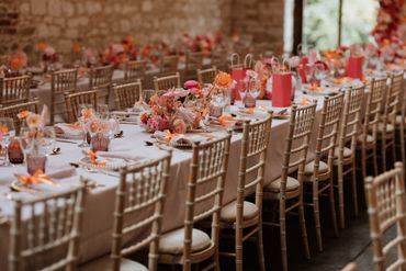 The barn was decorated with long banquet tables with pink table cloths and low vibrant florals and bud vases. We chose to do personalised ribbons for our guests as we didn't do menu's so wanted something with extra detail on the place settings. Taddle farm tents supplied the festoon lighting which lit the venue throughout the day and into the evening.