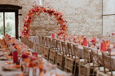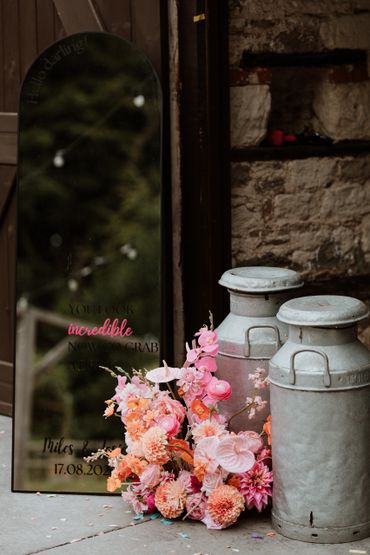 Miles and I chose to get married at Gorwell Fram in Abbotsbury. We first visited this venue for a booking with my events company and instantly fell in love. It is so private and feels like its own sanctuary. Surrounded by beautiful nature with amazing views of the Jurassic coastline. The venue also had 6 onsite cottages for guests and the bridal party to enjoy the whole weekend in and also a campsite for others to enjoy. We fully made the venue feel like our own for the whole weekend and filled the barn with the most gorgeous vibrant colours.