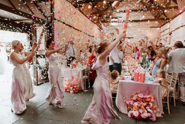 After the drinks reception we then headed into the barn for our meal which we opted for a bbq style dinner from Sorrels which worked really well with the venue. Our bridal party planned a huge entrance into the barn, picture saxophone player (DJ funky t), confetti cannons in all directions, tequila trolly and beer belts accompanied by Abba Gimme Gimme Gimme! It really set the whole tone for the evening and got the whole party started. If you can get your bridal party involved in a wedding breakfast entrance I absolutely recommend you do!