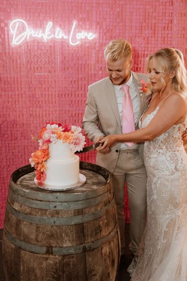 For the evening decor, I chose to have a hot pink sequin wall to add in some colour to the dance floor end with a neon light for effect. I just loved how the vibrance of our decor mixed with the rustic barn!